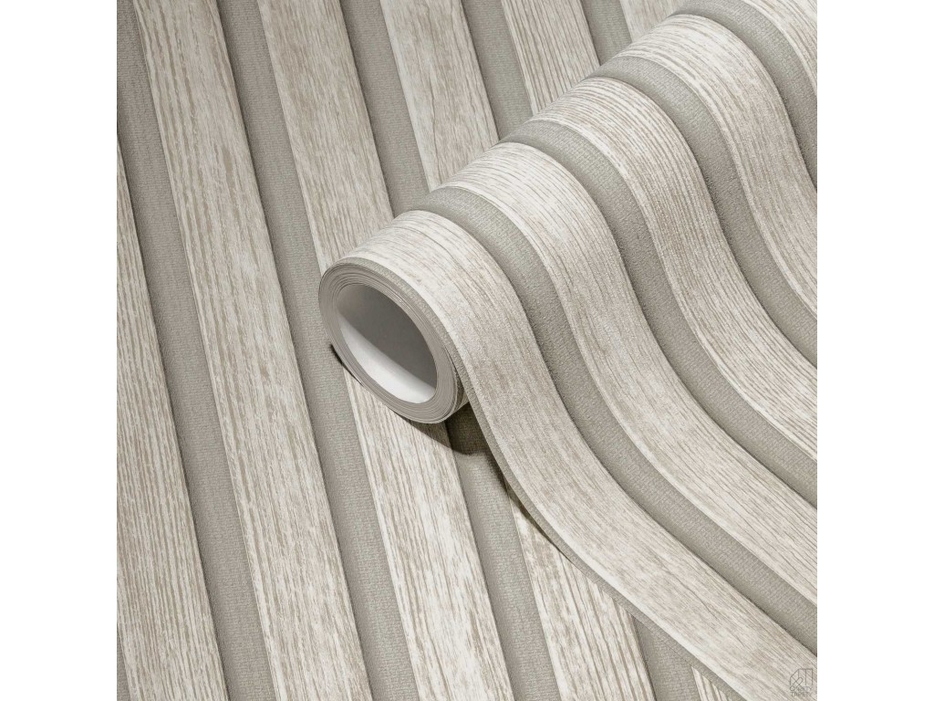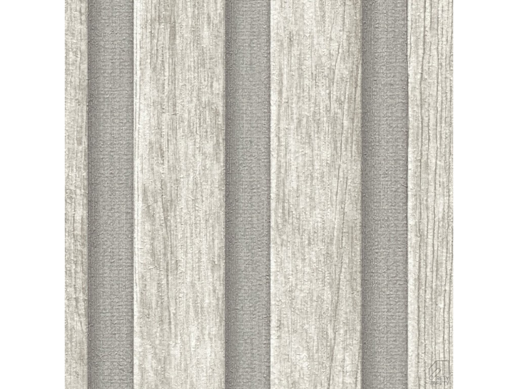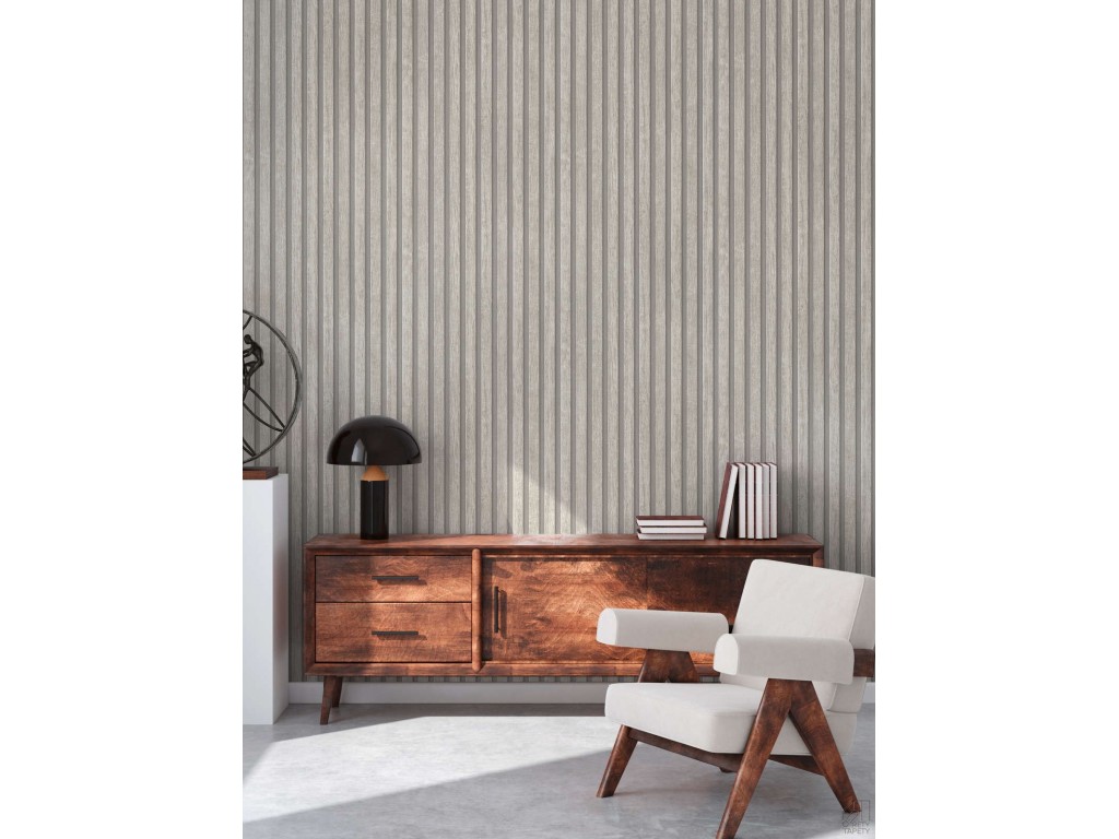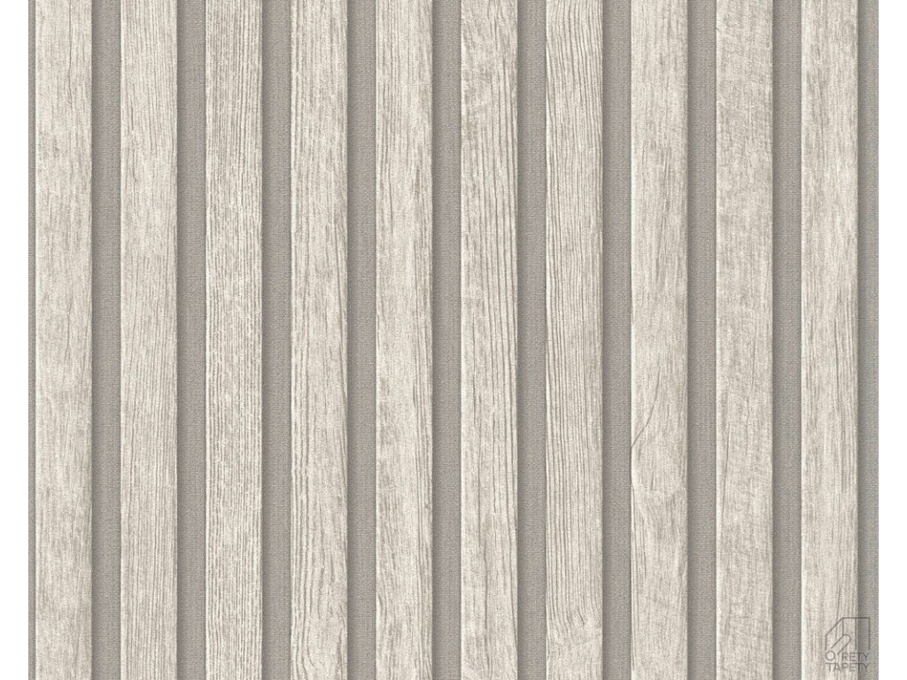 Tapeta na flizelinie niemieckiej firmy A.S. Creation. Modny wzór to doskonała imitacja drewnianych lameli w kolorze jasno szarym na ciemniejszym tle.