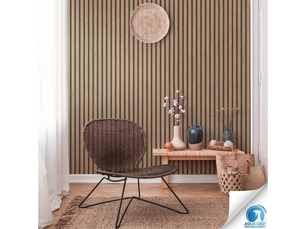 Tapeta utrzymana jest w naturalnej kolorystyce ciepłego drewna, beżu i brązu, z kontrastującymi ciemniejszymi paskami, które tworzą efekt dekoracyjnych lameli. Taka kompozycja kolorów doskonale pasuje do wnętrz w stylu skandynawskim, boho, japandi oraz nowoczesnym.