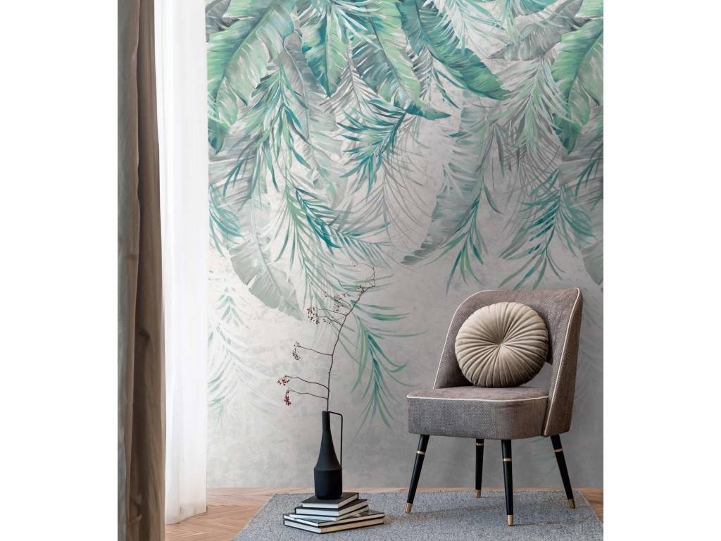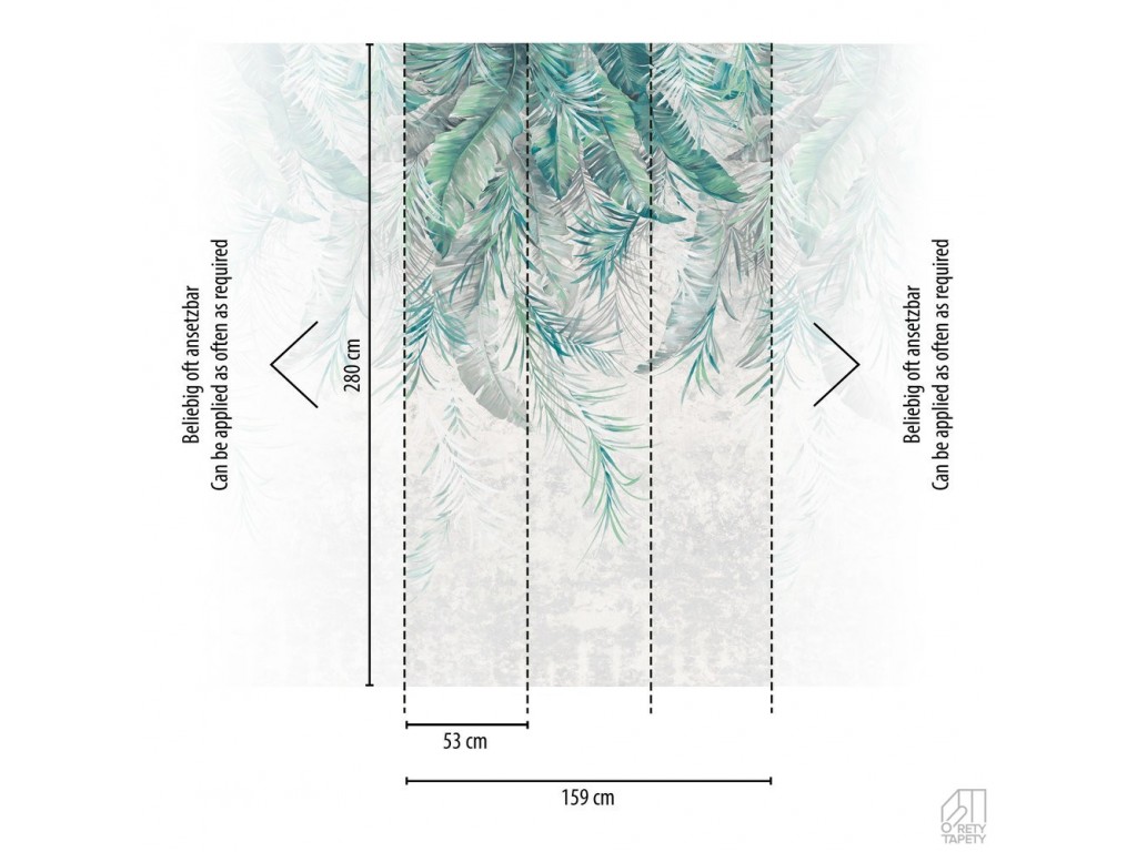 Nowoczesna tapeta w formie panelu muralu bez konieczności pasowania wzoru składająca się z 3 elementów łącznej szerokości 1,59cm i wysokości 2,80m przedstawiająca liście zwisające z góry w kolorach turkusu i szarości na betonowym tle wyglądające bardzo naturalnie.