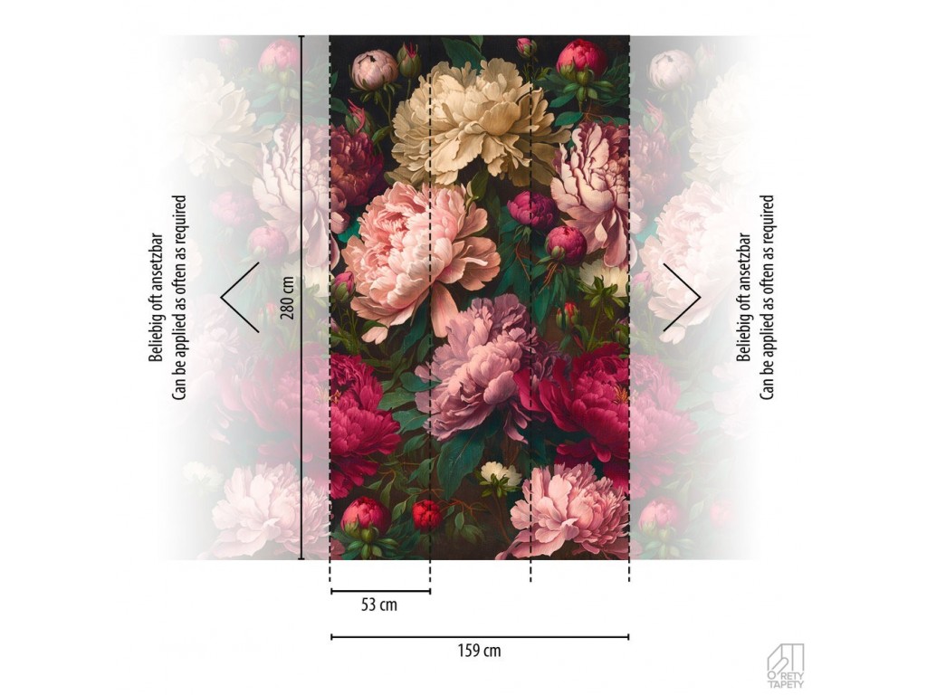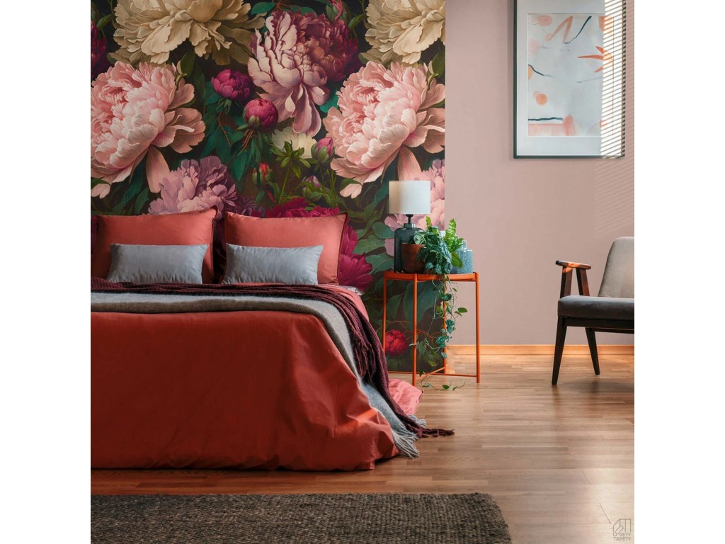 Nowoczesna tapeta w formie panelu muralu bez konieczności pasowania wzoru składająca się z 3 elementów łącznej szerokości 1,59cm i wysokości 2,80m przedstawiająca duże kolorowe kwiaty piwonie wyglądające bardzo naturalnie dające efekt trójwymiarowości na ścianie