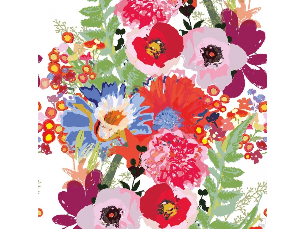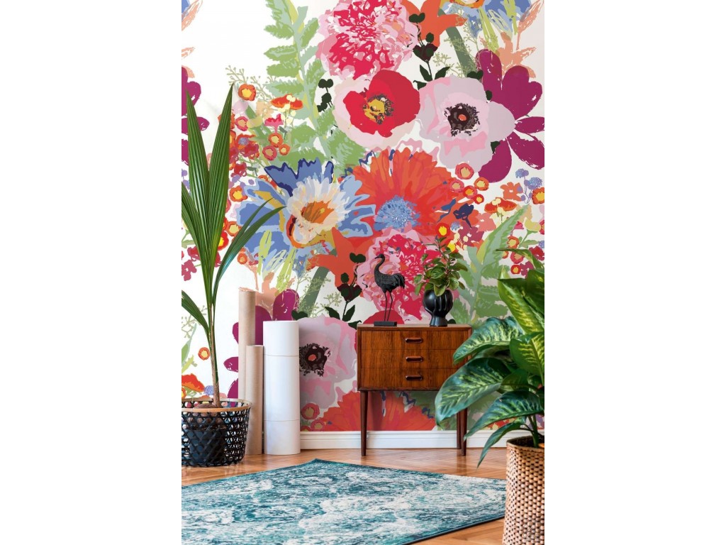 Nowoczesna tapeta w formie panelu muralu bez konieczności pasowania wzoru składająca się z 3 elementów łącznej szerokości 1,59cm i wysokości 2,80m przedstawiająca kolorowe malowane kwiaty na białym tle.