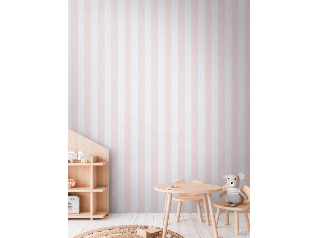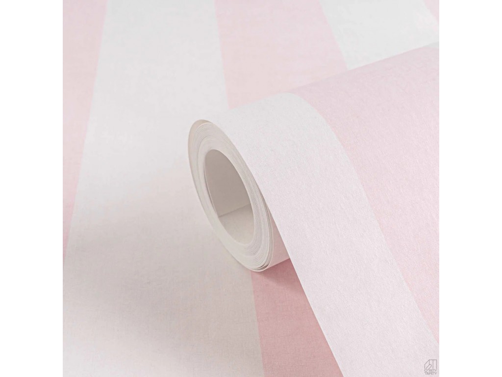 Nowoczesna tapeta przedstawiająca różowo białe pasy o szerokości 9cm wyglądające bardzo naturalnie na ścianie.