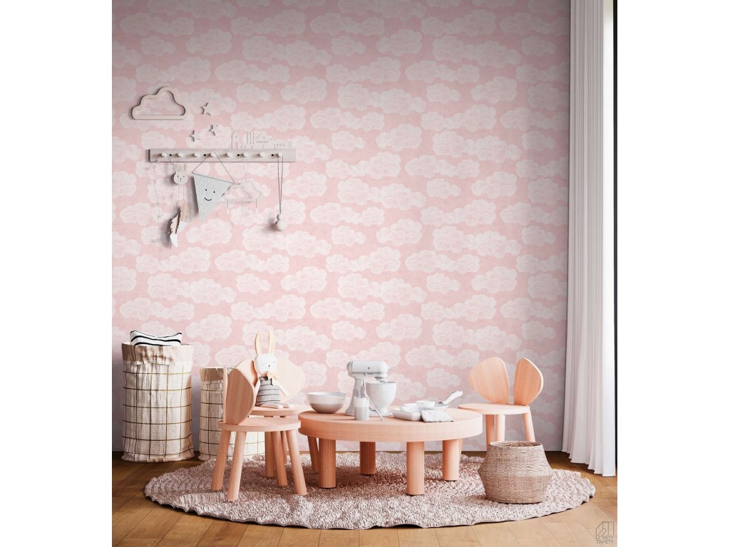 Nowoczesna tapeta do pokoju dziecięcego przedstawiająca białe chmurki na różowym tle wyglądająca bardzo naturalnie.