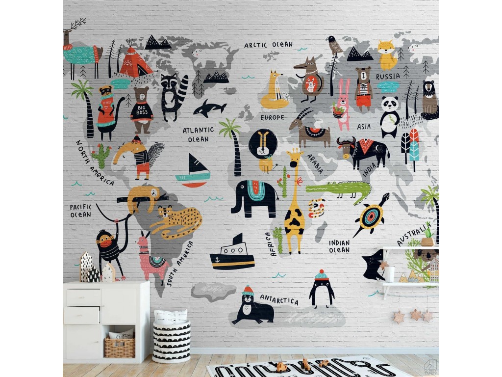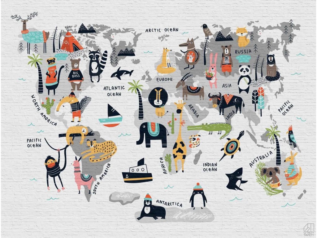 Nowoczesna tapeta w formie panelu, muralu bez konieczności pasowania wzoru składająca się z 7 elementów łącznej szerokości 371cm i wysokości 2,80m przedstawiająca namalowaną mapę świata na białej ścianie z cegły z oznaczonymi kontynentami i występujących na nich gatunkami zwierząt.
