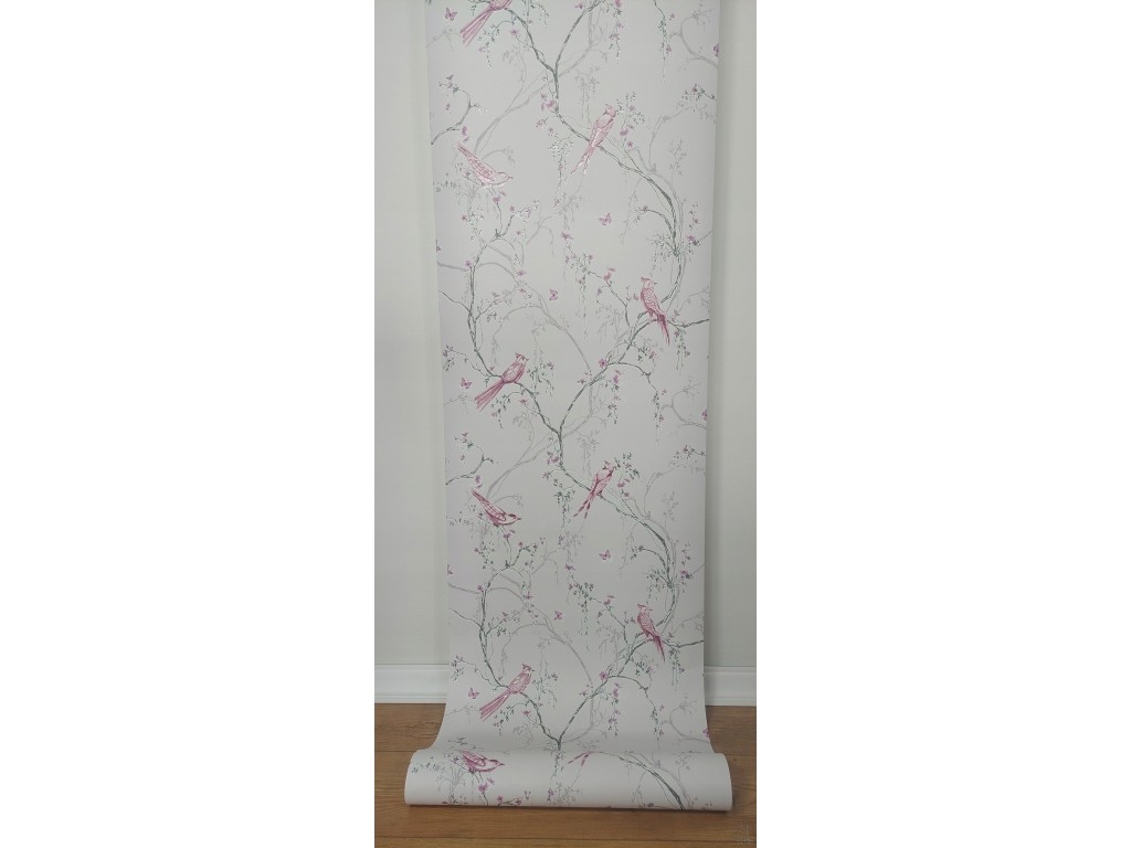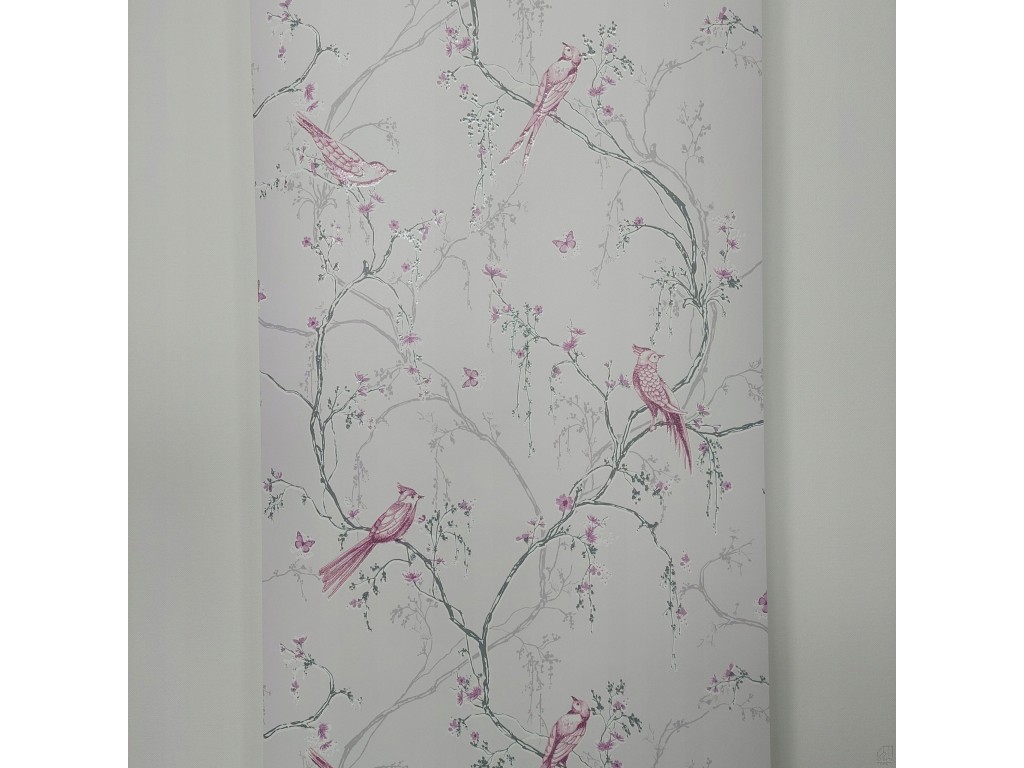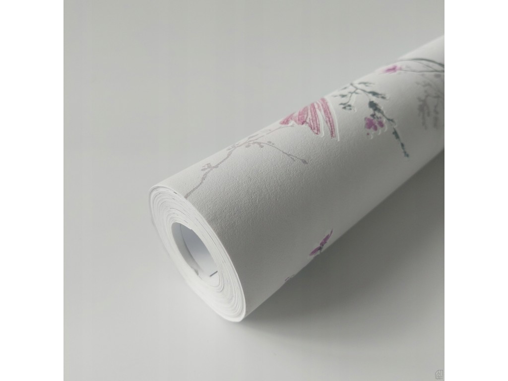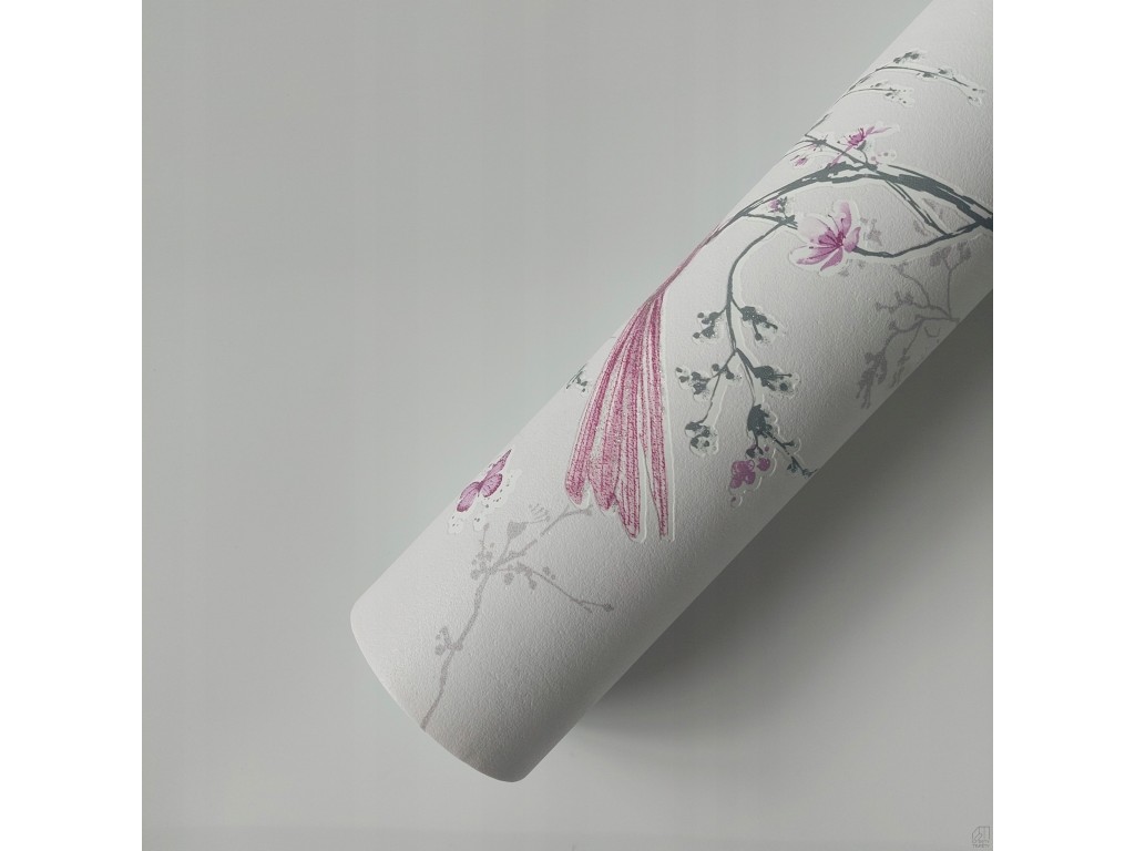 Stwórz wyjątkową, bajkową przestrzeń w pokoju dziecka dzięki subtelnej tapecie z motywem ptaszków na delikatnych gałązkach. Urocze, różowe ptaki w połączeniu z drobnymi kwiatami i lekkim połyskiem brokatu tworzą spokojną, ciepłą i przytulną aranżację.