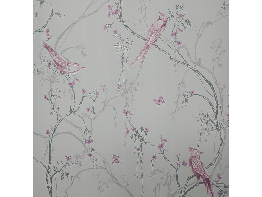 Tapeta dziecięca ptaszki na gałązkach różowa brokatowa – winylowa na flizelinie