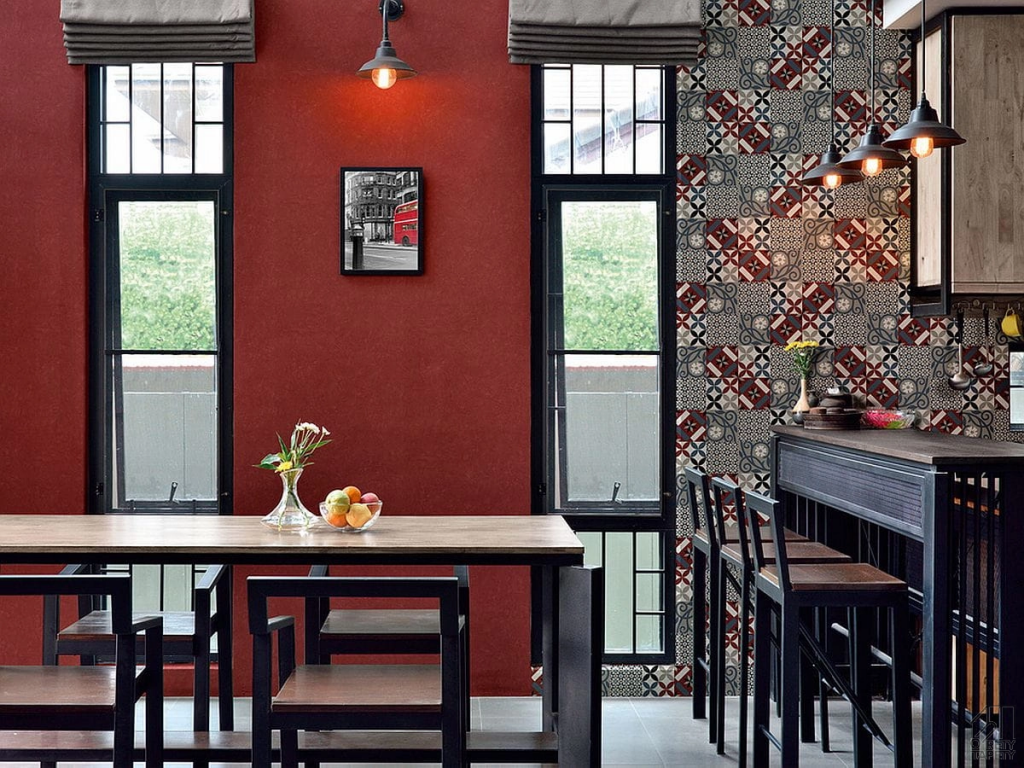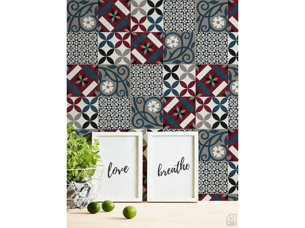 Tapeta w stylu marokańskich kafli z efektem patchworku. Połączenie bordo, granatu i szarości tworzy wyrazistą, dekoracyjną ścianę idealną do kuchni i nowoczesnych wnętrz.