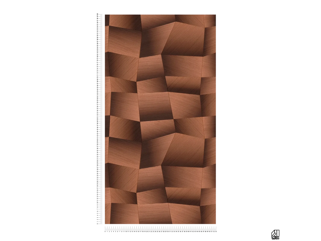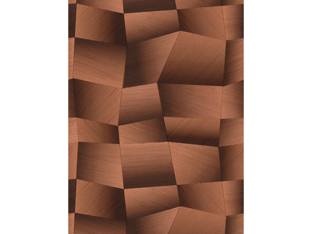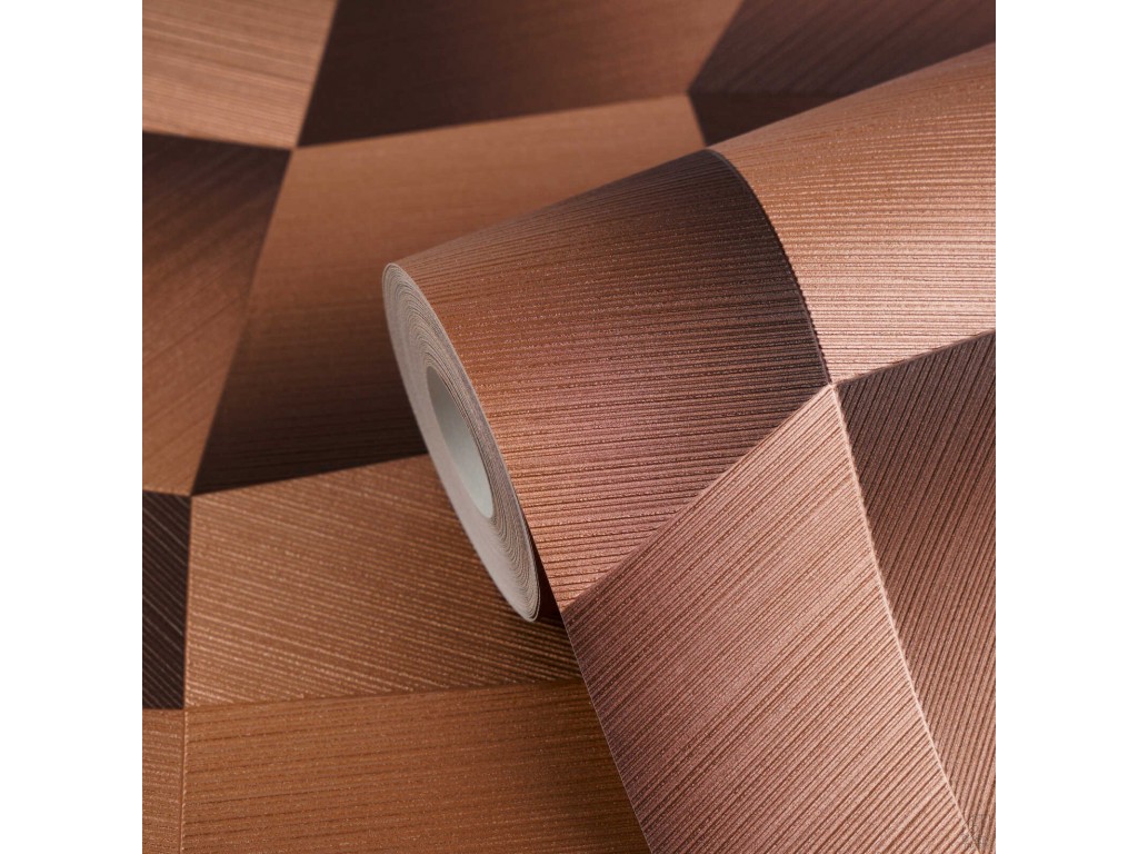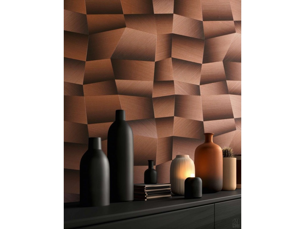 Wzór oparty na dynamicznych, geometrycznych bryłach daje wrażenie ruchu i przestrzeni, a delikatny połysk w odcieniach brązu i brązu metalicznego pięknie odbija światło, podkreślając detale i nadając ścianie ekskluzywny wygląd.