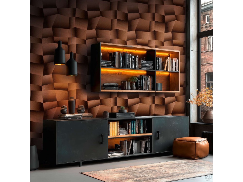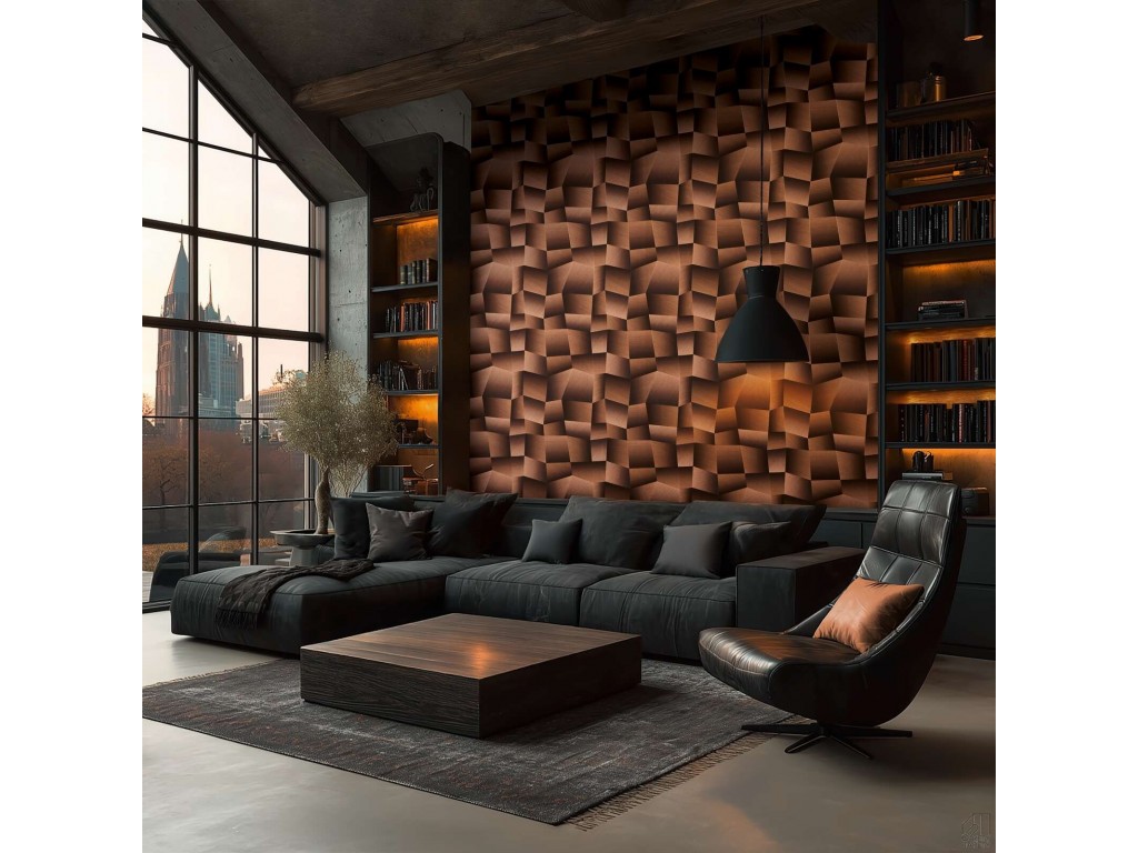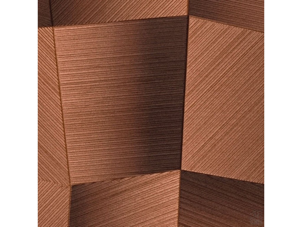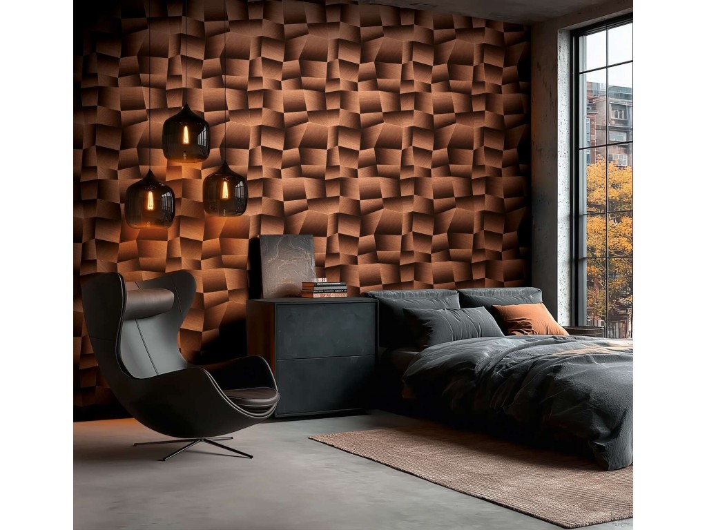 Wzór oparty na dynamicznych, geometrycznych bryłach daje wrażenie ruchu i przestrzeni, a delikatny połysk w odcieniach brązu i brązu metalicznego pięknie odbija światło, podkreślając detale i nadając ścianie ekskluzywny wygląd.
