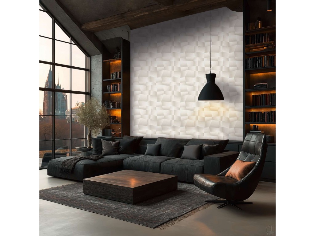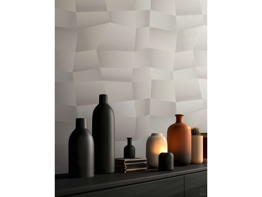 Nowoczesna tapeta ścienna z kolekcji Vibes & Styles marki A.S. Création, inspirowana przestrzennymi panelami dekoracyjnymi. Geometryczny wzór 3D tworzy efekt subtelnej głębi, który zmienia się wraz z oświetleniem, nadając wnętrzu elegancki i lekki charakter.